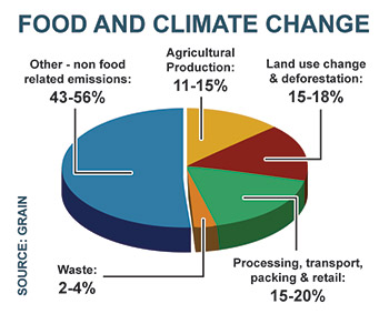Industrial agriculture is a key driver in the generation of greenhouse gases (GHGs). Synthetic fertilizers, pesticides, heavy machinery, monocultures, land change, deforestation, refrigeration, waste and transportation are all part of a food system that generates significant emissions and contributes greatly to global climate change. Industrial agricultural practices, from Concentrated Animal Feeding Operations (CAFOs) to synthetic fertilizer-intensive corn and soy monocultures, genetically modified to tolerate huge amounts of herbicide, not only contribute considerable amounts of GHGs, but also underpin an inequitable and unhealthy global food system. Modern conventional agriculture is a fossil fuel-based, energy-intensive industry that is aligned with biotech, trade and energy interests, versus farmer and consumers priorities.