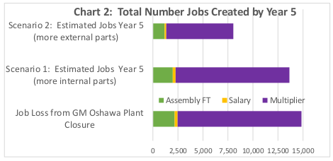 From a social point of view, rather than accepting the loss of over 5,000 assembly-related jobs at GM Oshawa, and an additional 10,000 multiplier jobs, this study shows that public investment and procurement can kick-start the new BEV assembly plant to create an estimated 2,300 to 2,900 manufacturing-related jobs and an additional 5,700 to 10,700 multiplier jobs, for a total of eight to thirteen thousand jobs by year 5.